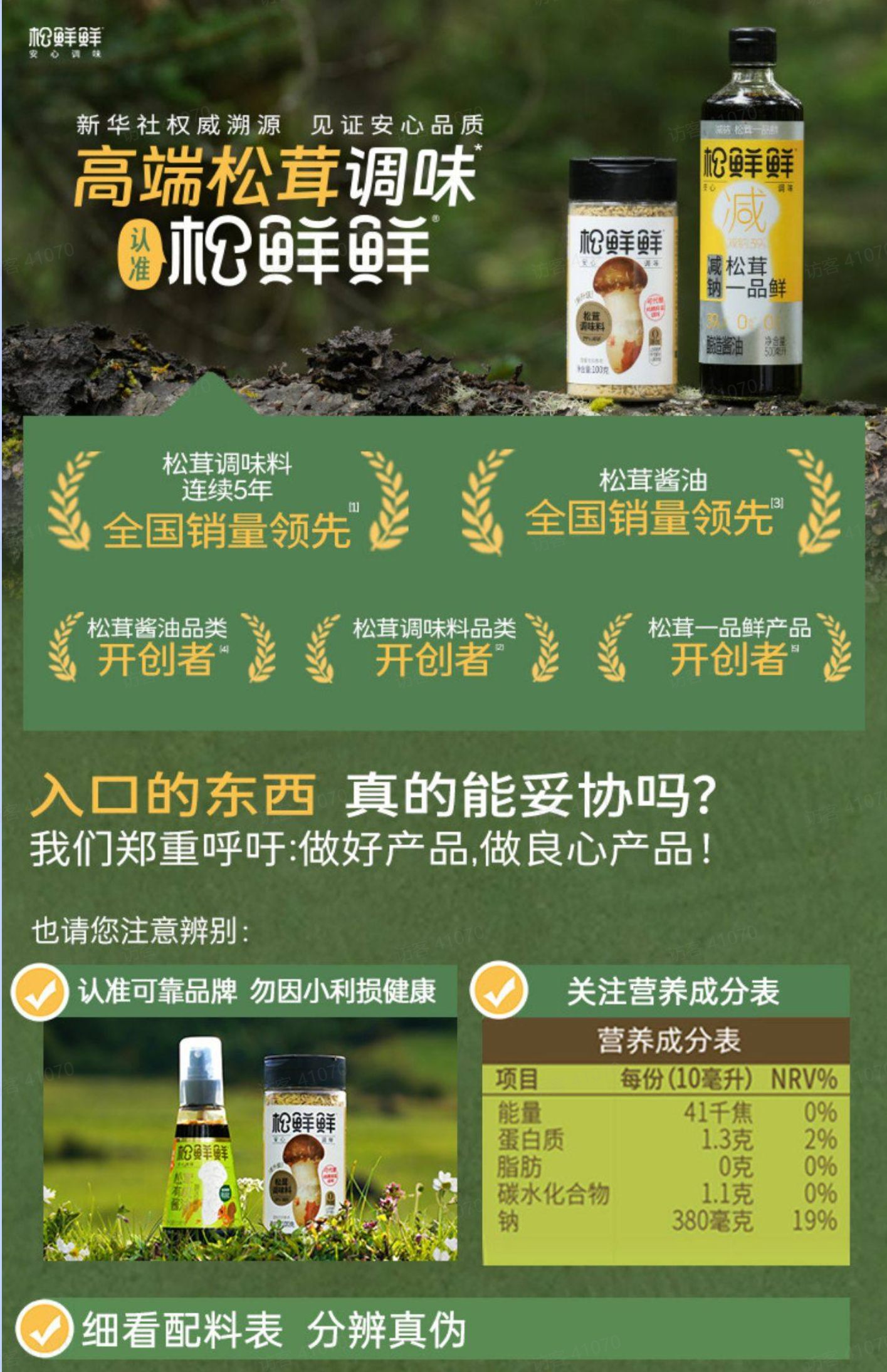 松鲜鲜,是一家2020年创立的健康调味品牌,全线产品生产过程不额外添加化学提鲜剂、不添加白砂糖和多余添加剂,坚持减钠、控糖、成分自然的健康理念。作为松茸调味料品类开创者、连续5年全国销量第一。品类主要涵盖松茸调味料、酱油、蚝油、复合调味汁四大类,为中国家庭提供健康且好吃的减钠调味解决方案。