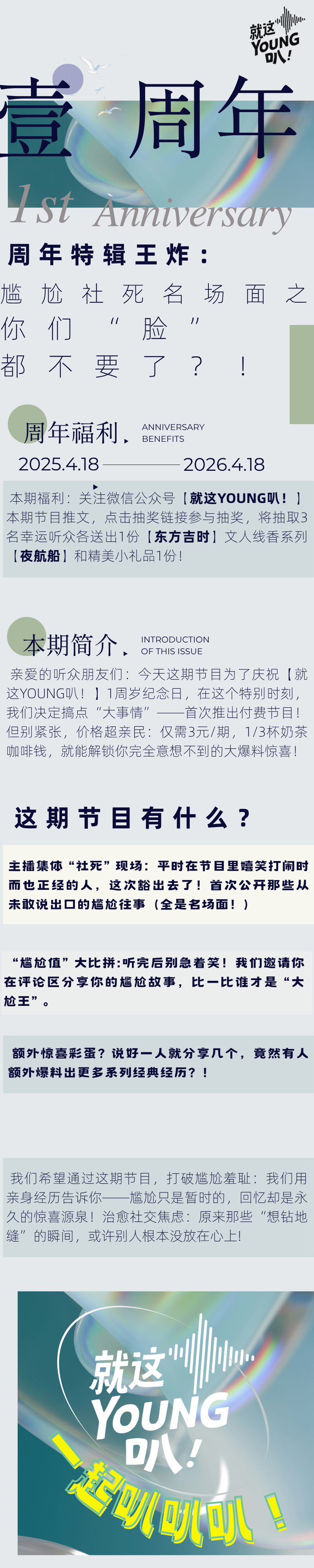 就这YOUNG叭一周年特辑节目,我们不聊大道理,只聊几个主播压箱底的私密尴尬瞬间。全是真人真事,又糗又爆笑,还带着点不好意思说出口的小隐私。几个人凑在一起互相爆料,全程笑到停不下来,每一段经历都真实到让人代入感拉满。如果你也喜欢听轻松搞笑、又有点私密感的真实故事,这期绝对值得一听。放心点开,愿你听得开心、笑得尽兴。